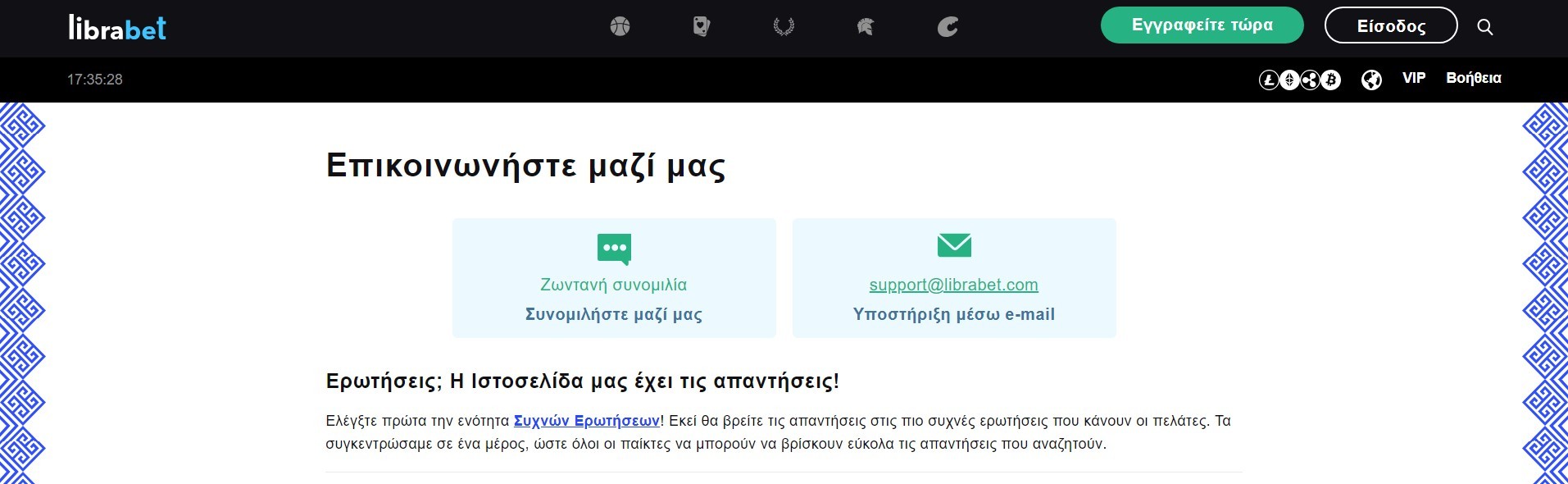 Το Librabet Casino προβάλλει αδιάκοπη επικοινωνία με την ομάδα υποστήριξης πελατών της πλατφόρμας, η οποία είναι κυρίως διαθέσιμη μέσω λειτουργίας live chat (24/7) και για αποστολή εγγράφων και παραπόνων μπορείτε να αποστείλετε το ημέηλ στο [email protected].